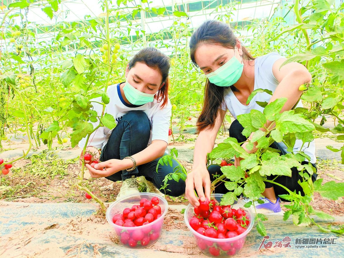 5月16日,村民在温宿县克孜勒镇永良蔬菜种植农民专业合作社大棚里采摘圣女果。克孜勒镇四个村统一规划建设了20亩温室大棚,种植各色蔬果,发展农业+旅游经济。 □艾则孜·沙木沙克摄